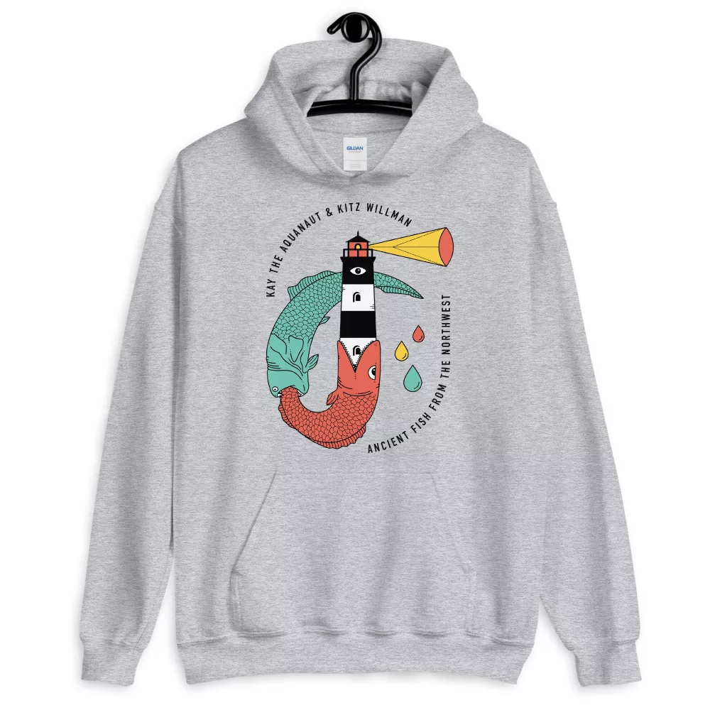 Featuring the cover art from the Kay the Aquanaut & Kitz Willman album Ancient Fish From the Northwest. Printed on a unisex Gildan crew neck sweatshirt. Design by 319 Heads.