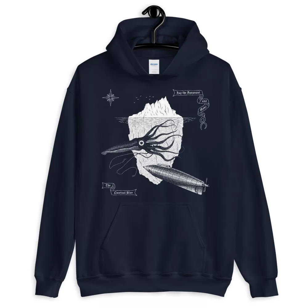 T-shirt featuring the cover art from the latest Kay The Aquanaut & Maki album, ‘The Nautical Blue.’ Printed on a Navy unisex Gildan hoodie. Design by 319 Heads