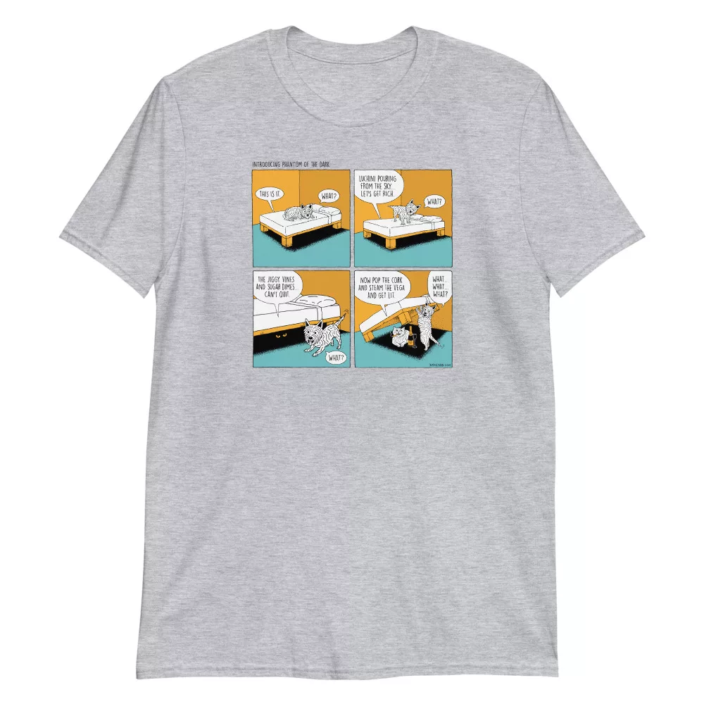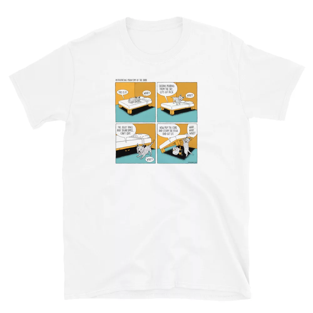 Introducing Phantom of the Dark, a comic strip by 319 Heads based on the hook from Camp Lo’s “Luchini”. Printed on a unisex Gildan Softstyle tee.