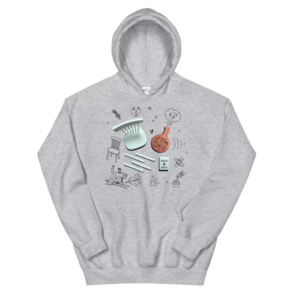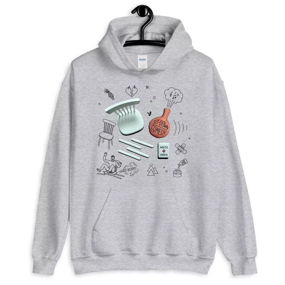 Featuring the cover art from Nolto & Dren’s Sit-Down Comedy album. Design by 319 Heads. Printed on a unisex Gildan hoodie.