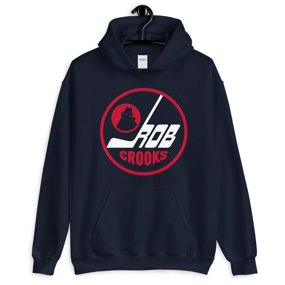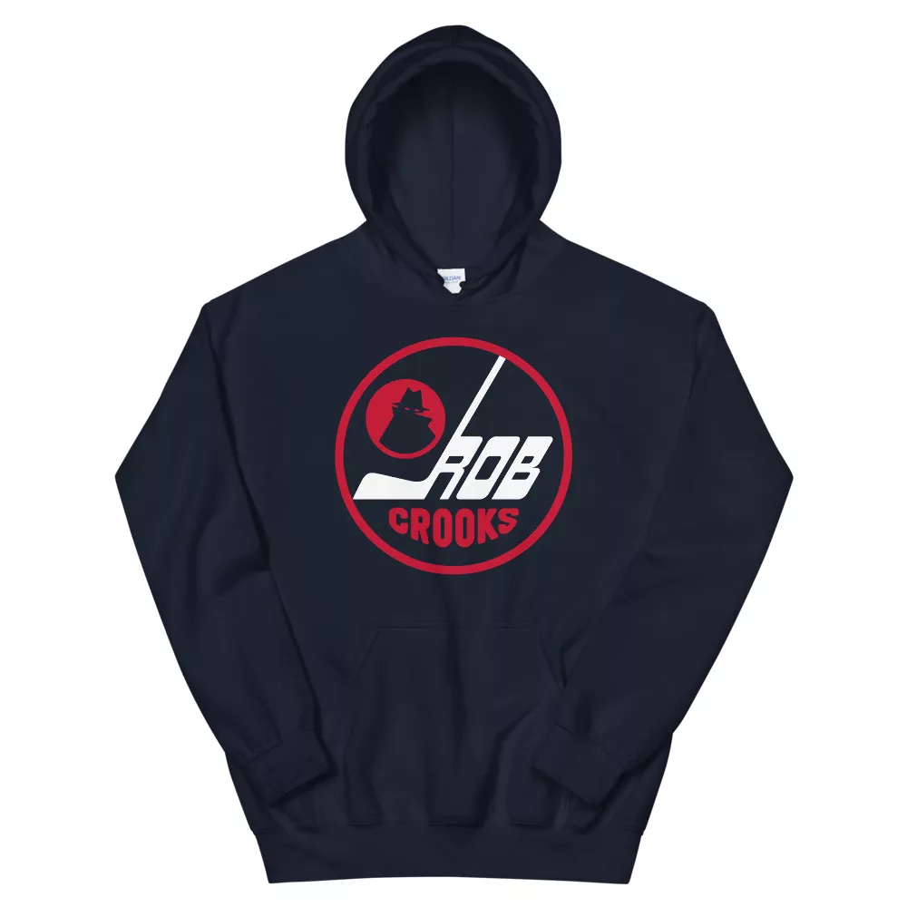 Rob Crooks, Winnipeg Jets inspired design by 319 Heads. Printed on a Navy unisex Gildan hoodie.